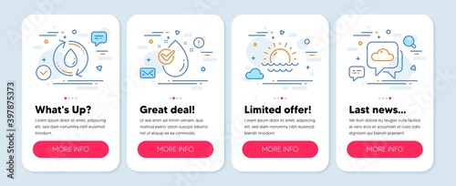Set of Nature icons, such as Sunset, Water drop, Refill water symbols. Mobile app mockup banners. Weather forecast line icons. Sunny weather, Clean aqua, Recycle aqua. Cloudy. Sunset icons. Vector