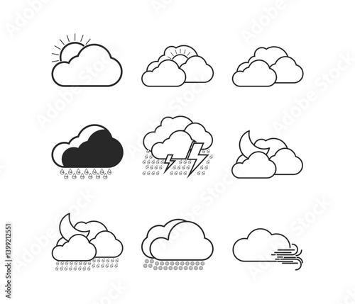 Set of nine distinct weather icons depicting sunny, partly cloudy, cloudy, rainy, thunderstorm, moonlit, night rain, snowy, and windy conditions.