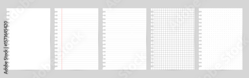 Set of notebook papers with black lines on white background and side circle holes. Includes plain, lined, lined with red margin, grid, and dotted pages.