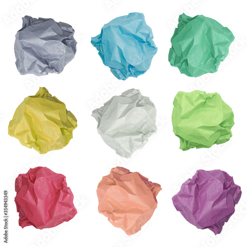Set of pastel colors paper balls isolated on white background. School, office concept. Symbol of idea, thought, planning. A clump of crumpled paper. Top view. Dry waste.