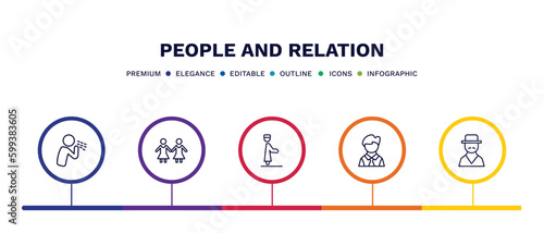 set of people and relation thin line icons. people and relation outline icons with infographic template. linear icons such as cough, no racism, qiyam, bussiness man, spanish man vector.