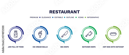 set of restaurant thin line icons. restaurant outline icons with infographic template. linear icons such as jar full of food, ice cream balls cup, big knife, butcher knife, hot dog with ketchup
