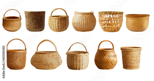 Set of rustic empty bamboo wicker rattan straw weave woven storage basket on transparent background cutout, PNG file.