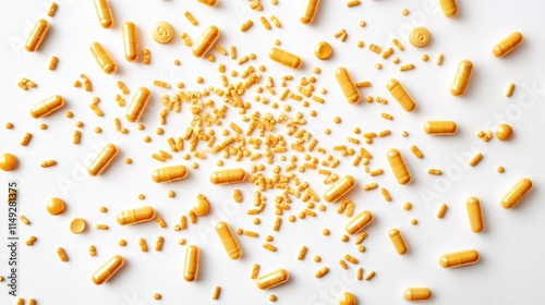 Set of scattered capsules on a white background. capsule bottles isolated on a white background, capsule pharmacy bottle pill drug concept