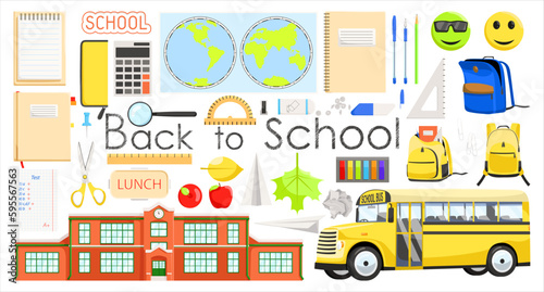Set of school item icons. Cartoon objects and supplies include: notebook, backpack, globe map, lunch box, school bus, ruler, building, apple. Education and study at school concept. Vector illustration