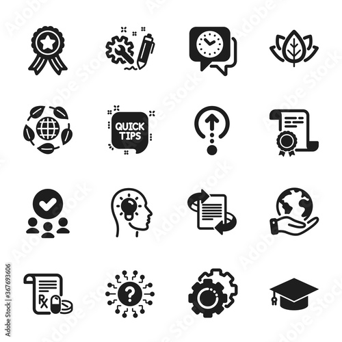 Set of Science icons, such as Engineering, Settings gears. Certificate, approved group, save planet. Swipe up, Marketing, Medical prescription. Quick tips, Graduation cap, Organic tested. Vector