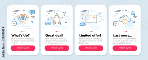 Set of Science icons, such as Monitor, 5g wifi, Star symbols. Mobile screen mockup banners. Cloud protection line icons. Computer component, Wireless internet, Best rank. Storage security. Vector