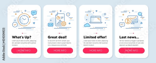 Set of Science icons, such as Report, Time change, Laptop symbols. Mobile app mockup banners. Bitcoin chart line icons. Presentation document, Clock, Computer. Cryptocurrency statistics. Vector