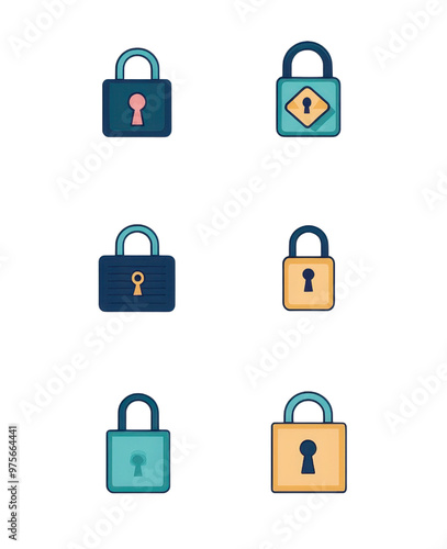 Set of six colorful padlock icons in various designs, representing security and privacy. Ideal for digital and print use.