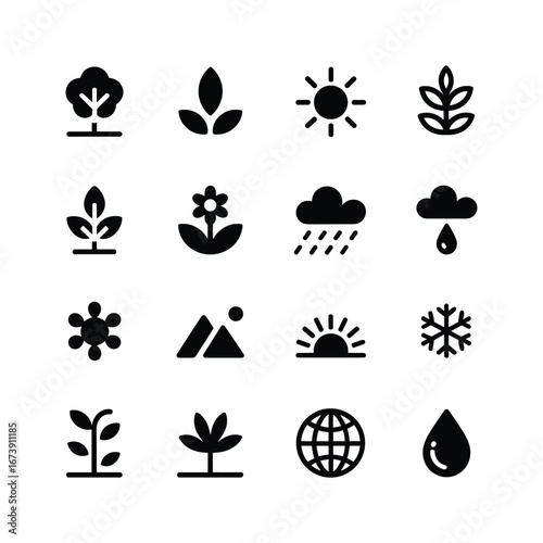 Set of sixteen simple icons representing nature weather and growth in a clean modern style