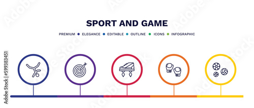 set of sport and game thin line icons. sport and game outline icons with infographic template. linear icons such as breakdance, dartboard with dart, flying shoes, boxing glove, balls vector.