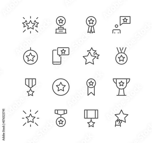 Set of star and related icons, award, rating, medal, ribbon badge, trophy, shining star and linear variety vectors.