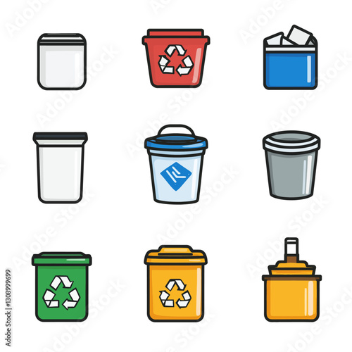 Set of stylized trash cans with recycling symbols, waste management icons.