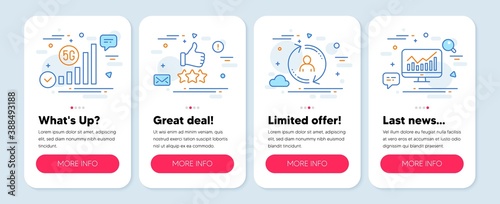 Set of Technology icons, such as 5g wifi, User info, Rating stars symbols. Mobile app mockup banners. Statistics line icons. Wireless signal, Update profile, Thumb up. Financial report. Vector