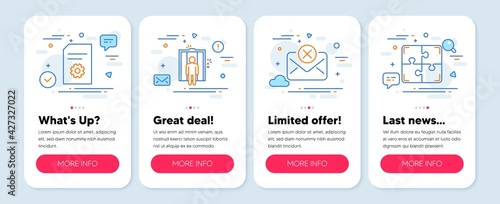 Set of Technology icons, such as File settings, Elevator, Reject mail symbols. Mobile screen banners. Puzzle line icons. File management, Lift, Delete letter. Engineering strategy. Vector