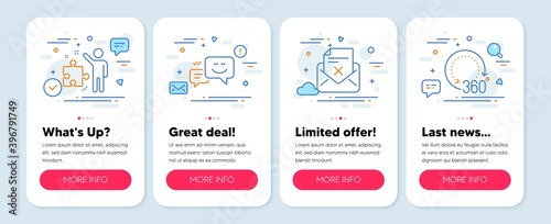 Set of Technology icons, such as Reject letter, Happy emotion, Strategy symbols. Mobile screen mockup banners. 360 degrees line icons. Delete mail, Web chat, Business plan. Panoramic view. Vector