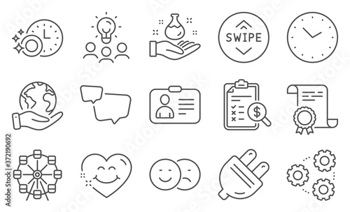Set of Technology icons, such as Speech bubble, Smile face. Diploma, ideas, save planet. Swipe up, Gears, Dishwasher timer. Id card, Time, Chemistry lab. Vector