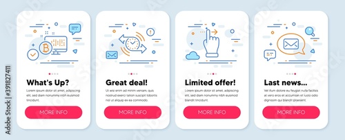 Set of Technology icons, such as Touchscreen gesture, Timer, Bitcoin system symbols. Mobile app mockup banners. Messenger line icons. Slide right, Stopwatch, Cryptocurrency monitor. Vector