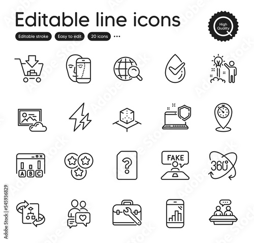 Set of Technology outline icons. Contains icons as Face biometrics, Photo cloud and Technical algorithm elements. Full rotation, Survey results, Timer web signs. Employees talk. Vector
