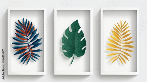 Set of three canvases with abstract colorful leaves in paper cut style. Plant art design