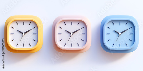 Set of three colorful clock icons showcasing modern design with simple features and varying tones in yellow, pink, and blue