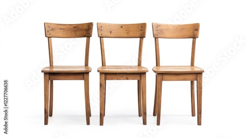 Set of three rustic wooden chairs isolated on a white background showcasing minimalist design and natural wood texture