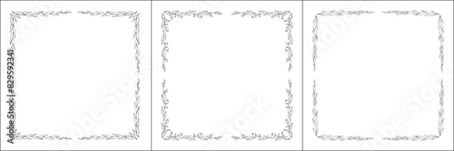 Set of three thin vegetal vector frames with leaves. Black and white. Vector frame for all sizes and formats. Isolated vector illustration.