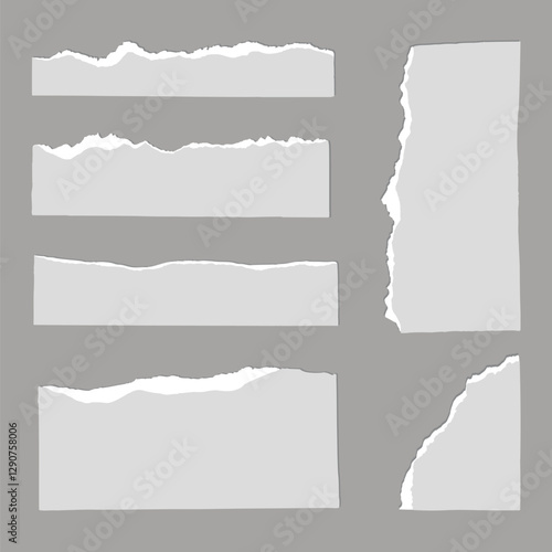 Set of torn paper edges on a gray background. Torn paper textures for design. Realistic torn paper effect for scrapbooking or collage projects. Gray element vector set.