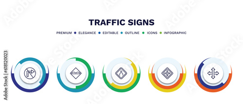 set of traffic signs thin line icons. traffic signs outline icons with infographic template. linear icons such as no turn, bump, narrow lane, intersection, crossroads vector.