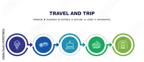 set of travel and trip thin line icons. travel and trip outline icons with infographic template. linear icons such as icecream, rubber, hotel bell, water craft, station vector.