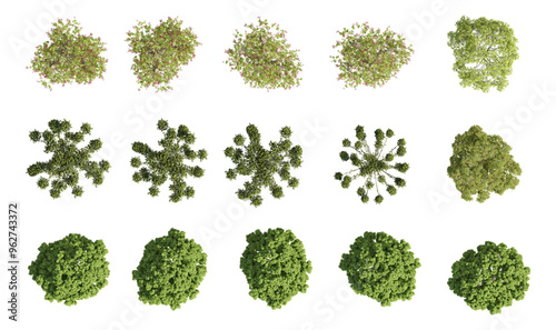 set of trees rendered from the top view, 3D illustration, for digital composition, illustration, 2D plans, architecture visualization