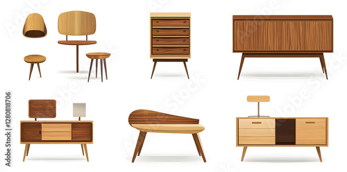 Set of trendy sofas, armchairs, with cushions in retro mid-century style. Modern soft furniture collection