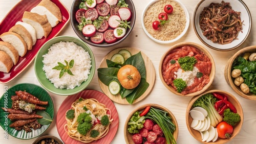 Set of various delicious food in black dishes isolated on transparent background, Top view of various menu served on plates.