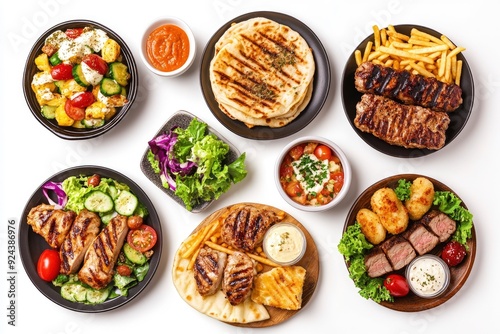 Set of various plates of food, top view, isolated on white background. with generative ai