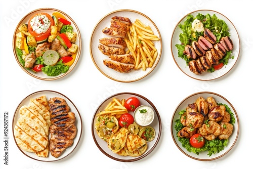 Set of various plates of food, top view, isolated on white background. with generative ai