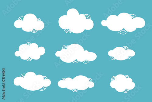 Set of various shapes of cartoon clouds. Flat design vector illustration. Cute puffy clouds isolated on blue background.