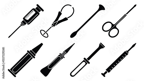 Set of vector illustrations featuring essential medical and surgical tools in monochrome style
