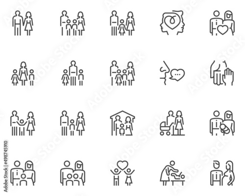 Set of Vector Line Icons Related to Family. Mother, Father and Children in a New House. Marriage, Motherhood, Child. Editable Stroke. 48x48 Pixel Perfect.