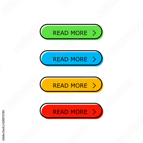 Set of vector modern trendy flat buttons. Different colors of main shapes and icons with black outline frames.