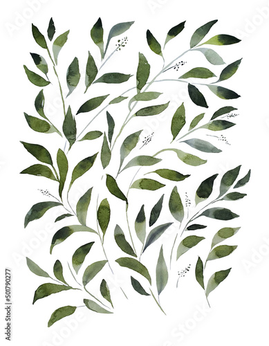 Set of watercolor design elements, branches, leaves, eucalyptus, painted in watercolor, botanical illustration isolated on transparent background