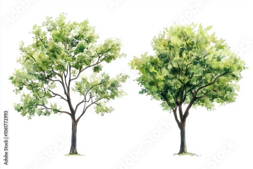 Set of watercolor green tree isolated on white background for landscape and architecture drawing, elements for environment and garden, botanical for section in spring