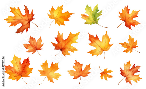 Set of watercolor illustrations of red yellow orange leaves isolated on a transparent background. Autumn nature design elements. Botanical image fordecoraton cards, posters, textile, menu, stickers.