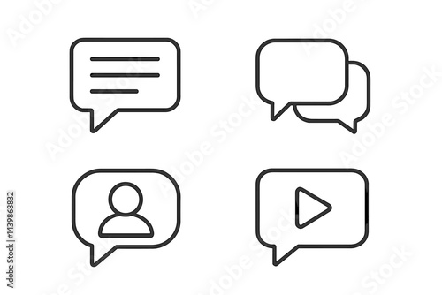 Set of web icons in line style featuring speech bubbles, user avatars, and playback symbols for digital communication