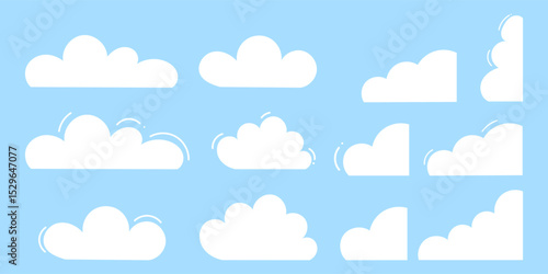 Set of white cloud icons on a blue background. Cloud shapes vary in size and form. Simple cloud design for weather or sky themes. Cloud icons in a grid layout. Weather illustration, vector set.