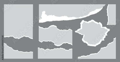 Set of white torn or ripped paper texture Scrapbook edge, notebook tear or blank page split vector illustration. Abstract realistic background.