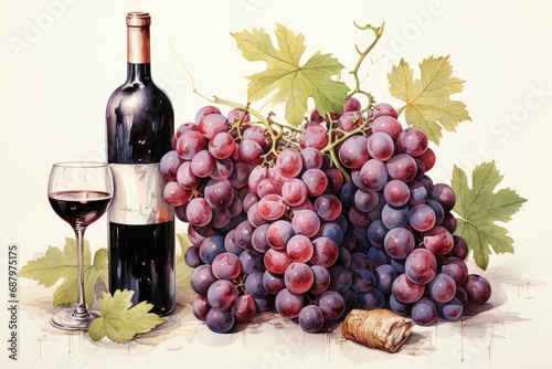 Set of white watercolor grapes and wine isolated on white. AI Generated