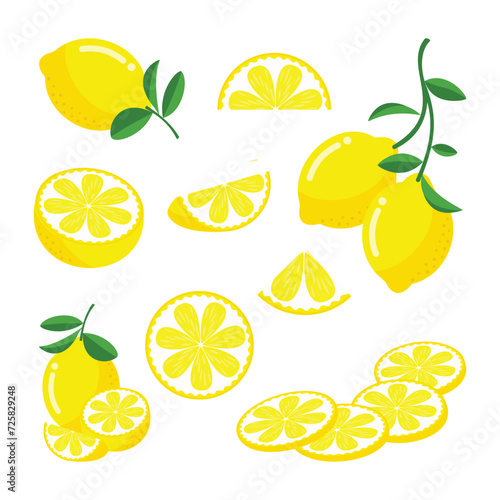Set of whole, cut in half, sliced on pieces lemon isolated on white background