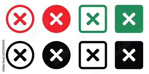 Set of Wrong Error Symbol in different styles—red, green, black, circle and square backgrounds. Perfect for concepts like approval, validation, selection, and completed tasks.