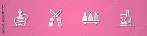 Set paper cut Wine in italian fiasco bottle, Gardening scissors, Bottle of wine and icon. Paper art style. Vector