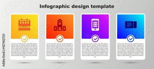 Set Passenger train cars, Railway station, Buy ticket online and Train. Business infographic template. Vector